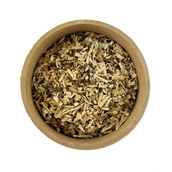 A top-down view of a cardboard container filled with motherwort herb, on white background.